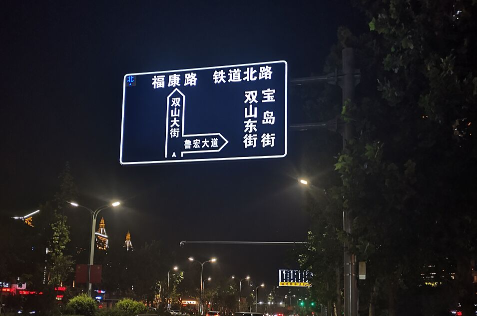 2017年6月,在濟(jì)南市安裝了一批面板顯示型主動(dòng)發(fā)光標(biāo)志,該標(biāo)志采用內(nèi)置全光源投射標(biāo)志面層,標(biāo)志面層發(fā)光部分采用進(jìn)口設(shè)備鏤空無(wú)筋雕刻,光源穿透鏤空層的專(zhuān)用透光膜,形成面板顯示型主動(dòng)發(fā)光效果,不僅增強(qiáng)了標(biāo)志的遠(yuǎn)距離視認(rèn)性和大角度視認(rèn),同時(shí)也為區(qū)域交通環(huán)境做出了畫(huà)龍點(diǎn)睛的效果,為地區(qū)打造交通亮點(diǎn),樹(shù)立城市示范大道,提供了創(chuàng)新元素。