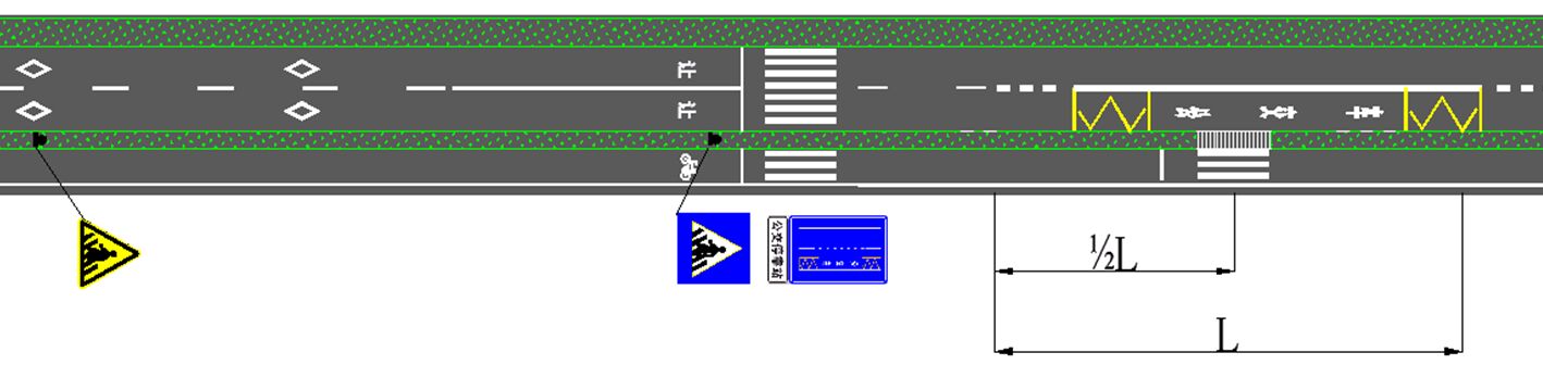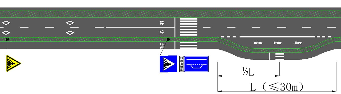 其中,站臺長度≤30米的,站臺1/2處設(shè)置一道3米寬度人行橫道線,詳見下圖;