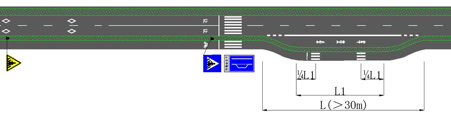 其中,站臺長度>30米的,頭尾1/4處分別設(shè)置3米寬度人行橫道線,詳見下圖;