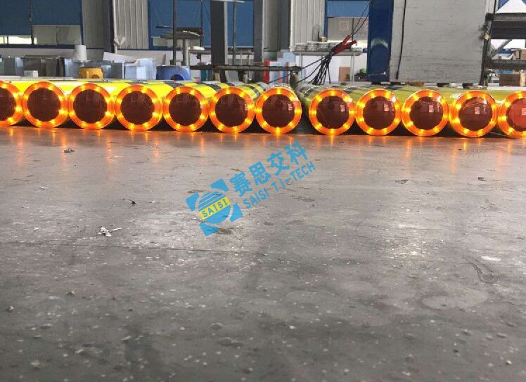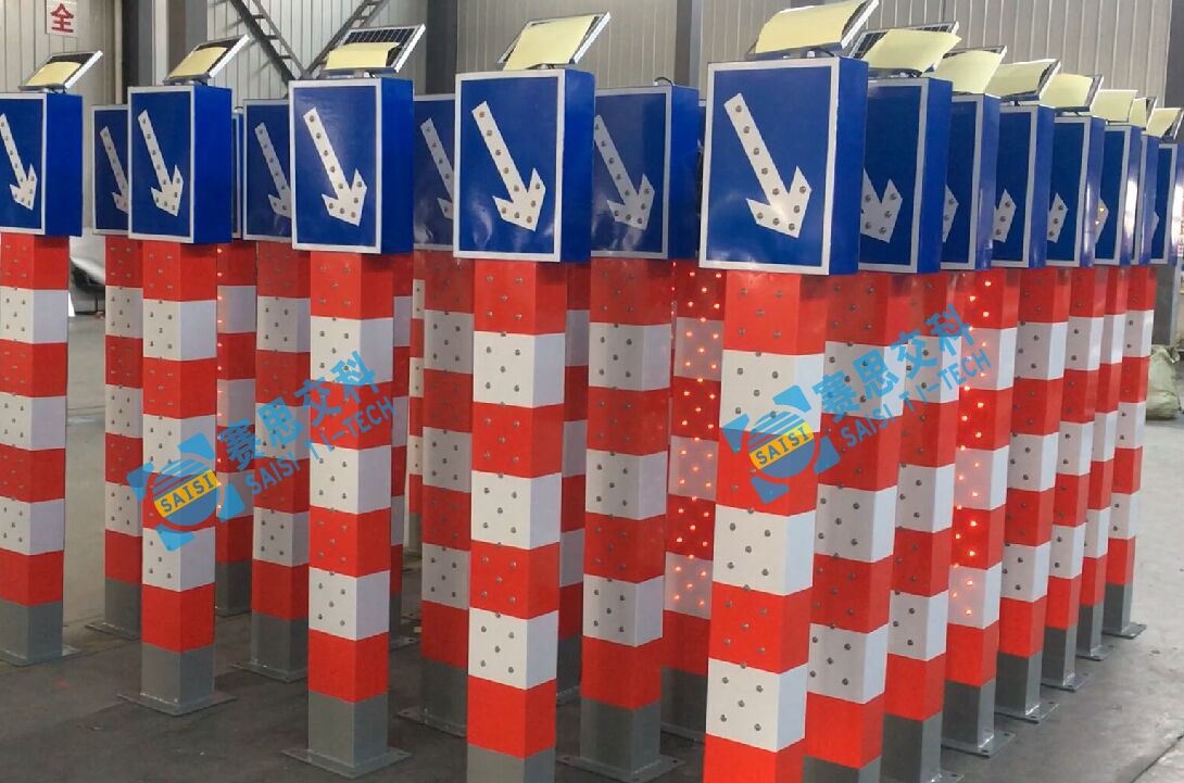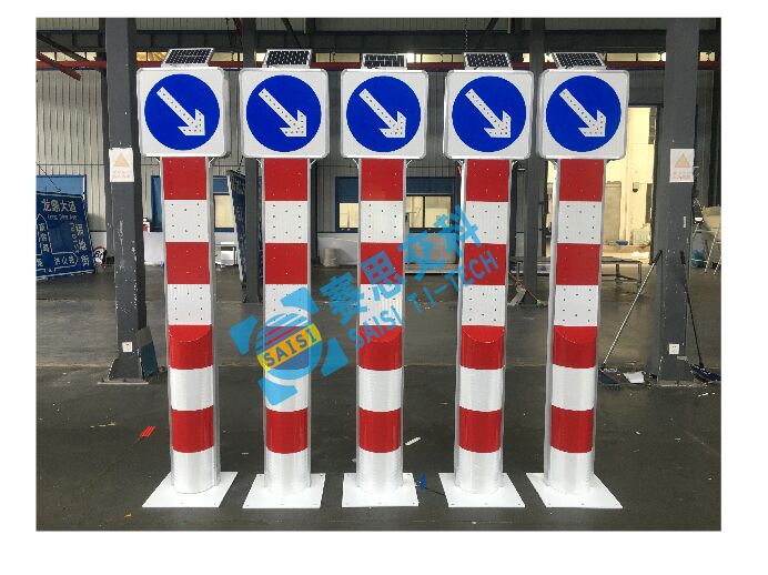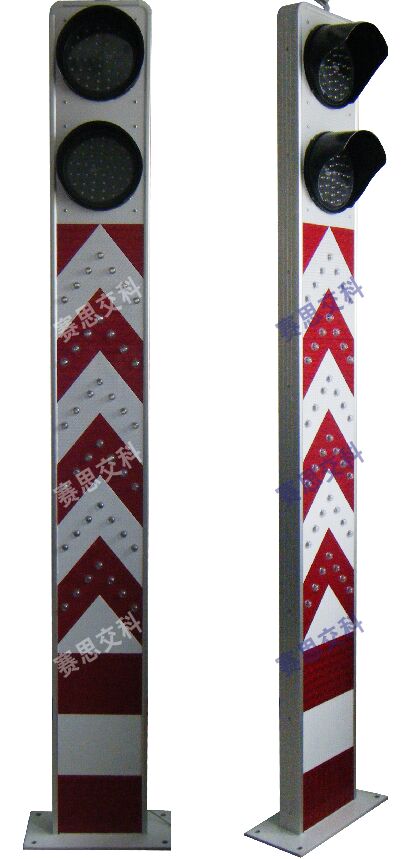 2、基本說明:一體式柱體結(jié)構(gòu),標志版面圖案中設(shè)置紅滿屏燈、紅滿屏燈,交替閃爍,柱體上設(shè)置警示發(fā)光管,采用太陽能蓄電池供電,設(shè)置于危險路段分道、高架匝道上下口等。