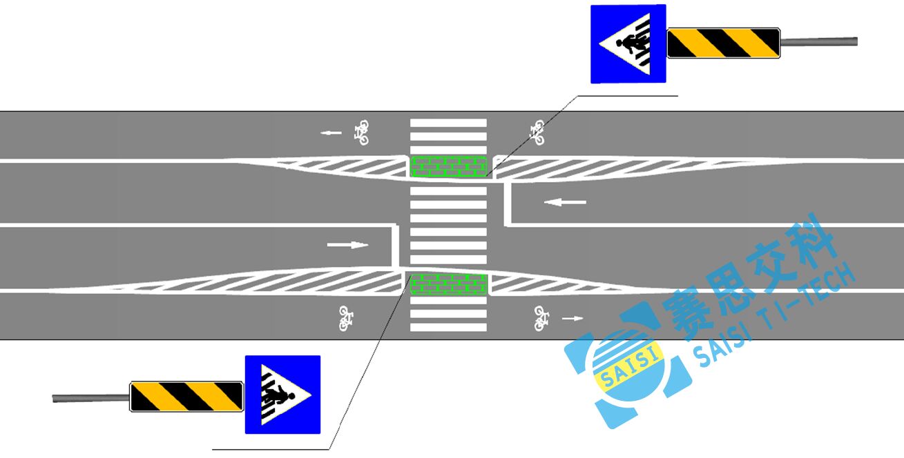 通過(guò)增設(shè)實(shí)體安全島及上游車道寬度進(jìn)行壓縮,強(qiáng)制車輛減速行駛,提高行人過(guò)街的安全性。兩端設(shè)置人行橫道指示標(biāo)志,建議采用主動(dòng)發(fā)光工藝,提升標(biāo)志的遠(yuǎn)距離視認(rèn)性,和動(dòng)態(tài)警示性。