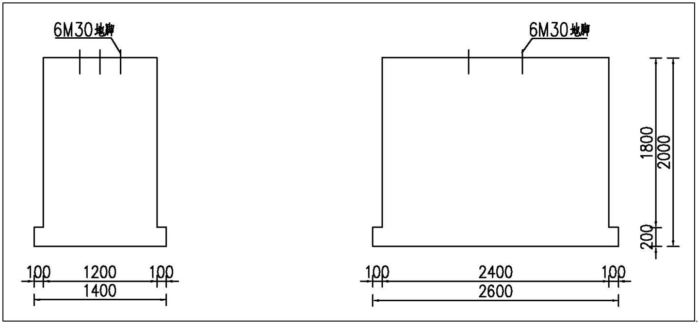 上層基礎(chǔ)寬 WF = 1.20(m), 高 HF = 1.80(m), 長 LF = 2.20(m),下層基礎(chǔ)寬 WF = 1.20(m), 高 HF = 0.20(m), 長 LF = 2.60(m)