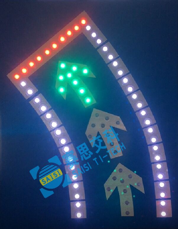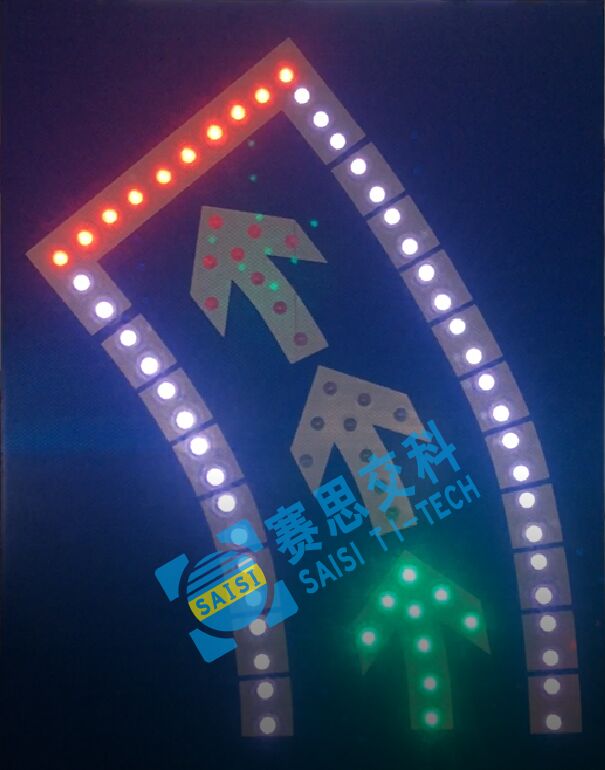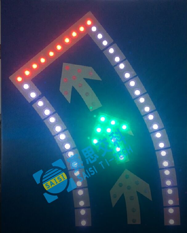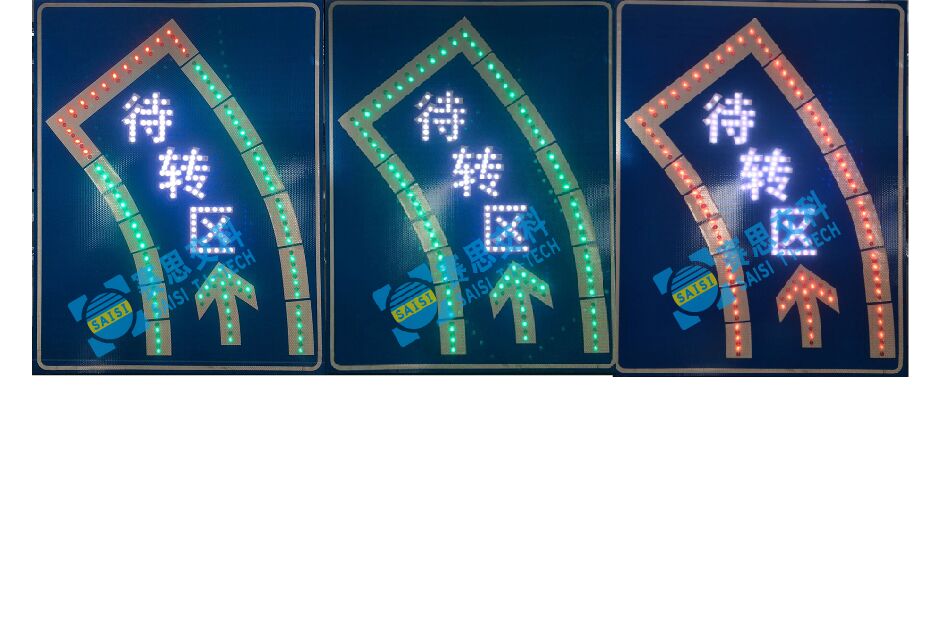2、工藝說明:標志版面由LED發(fā)光管組成停車線、邊緣線、箭頭圖形,通過控制模塊調(diào)取信號燈燈色狀態(tài),在標志版面形成動態(tài)三種狀態(tài),動態(tài)引導待轉(zhuǎn)車流通行權(quán)限。