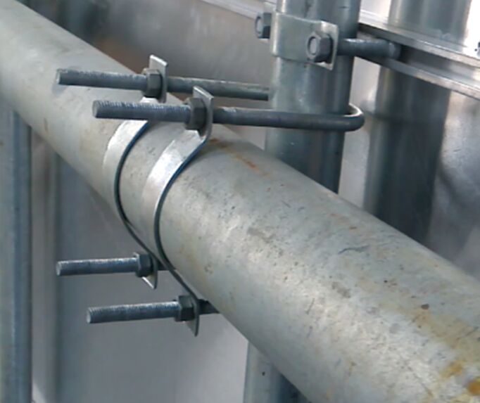 5、將圓管用U型卡箍在懸臂上下對卡,用對應(yīng)懸臂尺寸的抱箍半片固定于懸臂左右上,用M12螺帽固定。