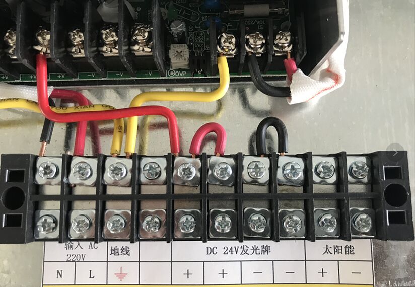 3、半透發(fā)光標(biāo)志上的電線接入控制箱內(nèi)的低壓DC-24V輸出端子,本次標(biāo)志正極為棕色線;負(fù)極為藍(lán)色線。外接電源線接入高壓輸入端子。地線必須接地,導(dǎo)入地面土壤內(nèi)。