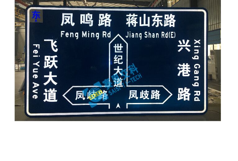 4、指路標志 。在道路中,根據(jù)不同道路級別,設置于交叉口進口方向,通常據(jù)進口車道停止線80—120米范圍內。