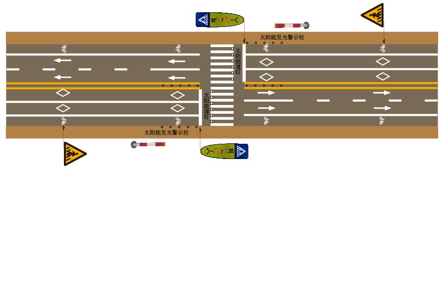 當(dāng)一邊的激光雷達(dá)監(jiān)測(cè)設(shè)備在人行橫道線兩端監(jiān)測(cè)到有行人時(shí),向兩側(cè)的注意行人發(fā)光警告標(biāo)志、語音播報(bào)系統(tǒng)發(fā)送無線控制信號(hào),同時(shí)點(diǎn)亮發(fā)光標(biāo)志和語音播報(bào)系統(tǒng),告知路段機(jī)動(dòng)車駕駛?cè)饲胺接行腥诉^街,注意禮讓行人。系統(tǒng)根據(jù)道路寬度,計(jì)算行人過街的通用時(shí)間,采用延時(shí)計(jì)算方法,當(dāng)超過延時(shí)長(zhǎng)度時(shí),監(jiān)測(cè)系統(tǒng)未監(jiān)測(cè)到新的人行過街信號(hào)時(shí),自動(dòng)關(guān)閉發(fā)光警示標(biāo)志和語音播報(bào)器,只到新的行人過街信號(hào)出現(xiàn)。總平面圖如下: