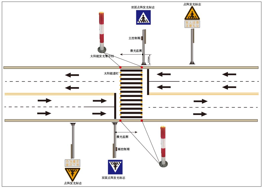 本智能行人過街預(yù)警系統(tǒng),主要包括:激光雷達(dá)監(jiān)測(cè)設(shè)備、人行橫道發(fā)光指示標(biāo)志(雙面)、注意行人發(fā)光警告標(biāo)志(輔標(biāo)"有人過街、注意禮讓")、語音播報(bào)器、太陽能發(fā)光警示柱、太陽能發(fā)光道釘、無線數(shù)據(jù)傳輸模塊、總控制系統(tǒng)(含軟件)等。