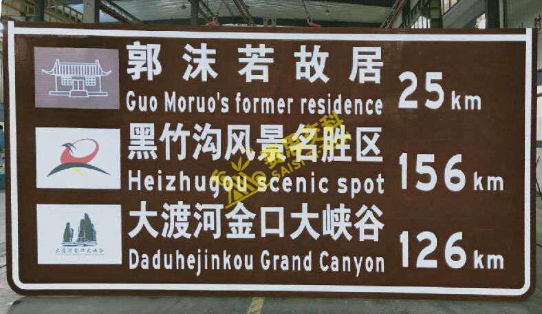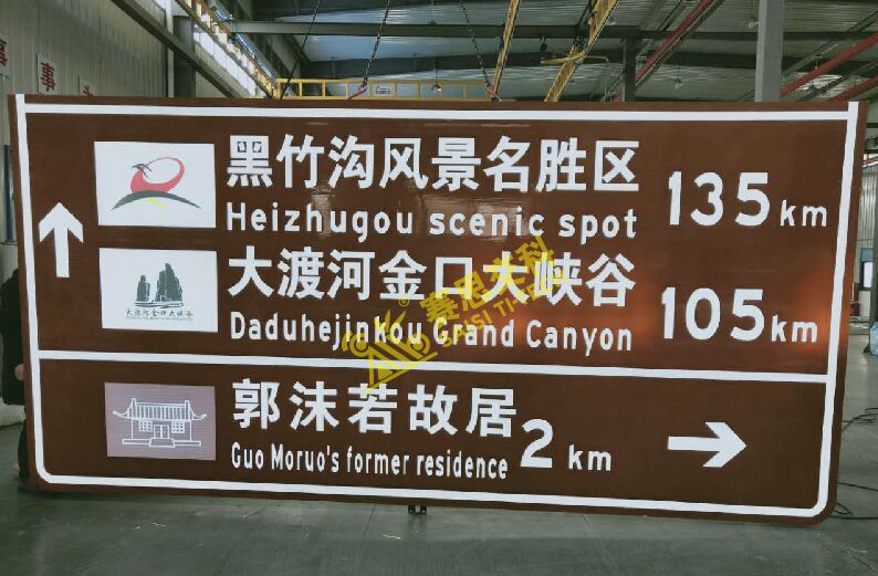 采用主動發(fā)光工藝的旅游標(biāo)志牌,其版面通常由:風(fēng)景點(diǎn)名稱文字、預(yù)告距離、引導(dǎo)方向箭頭、風(fēng)景區(qū)圖片LOGO等組成,標(biāo)志底板采用棕色反光膜(旅游標(biāo)志專用膜)。標(biāo)志主動發(fā)光工藝,采用內(nèi)置光源定向投射標(biāo)志面板,形成自主發(fā)光的效果。其優(yōu)點(diǎn)主要有: