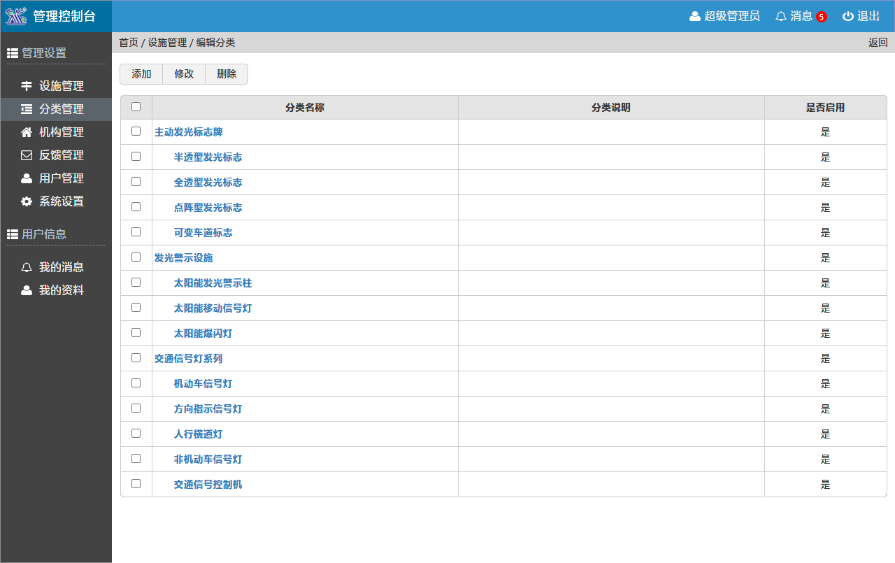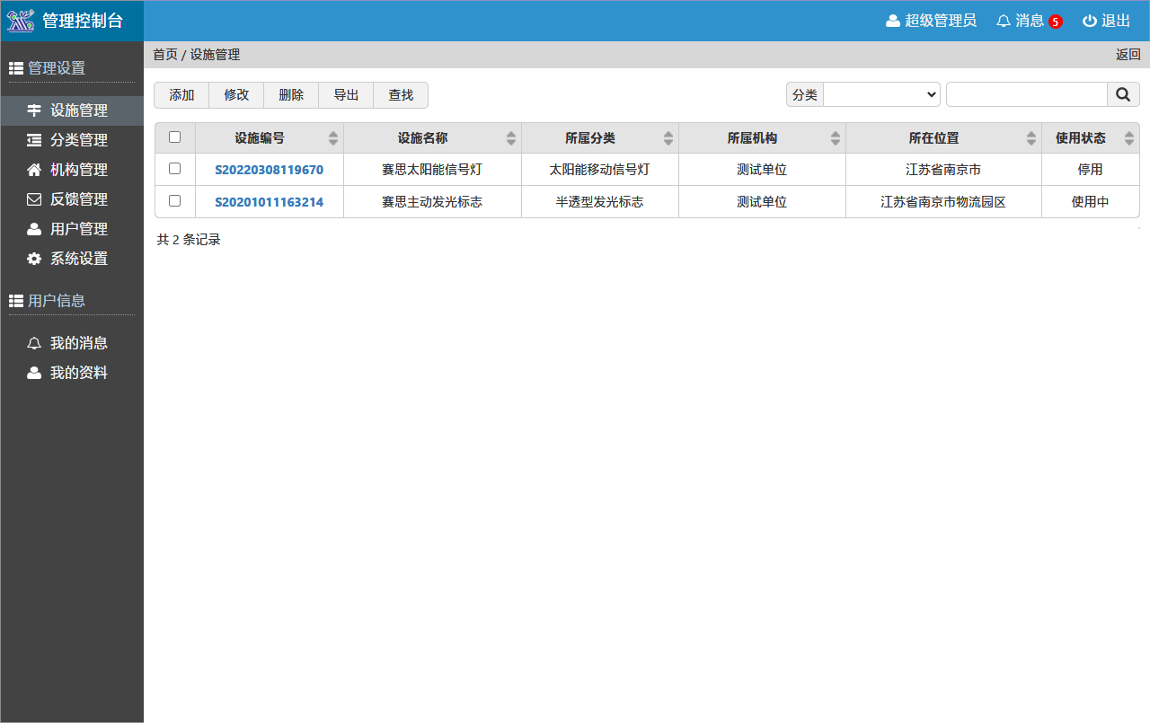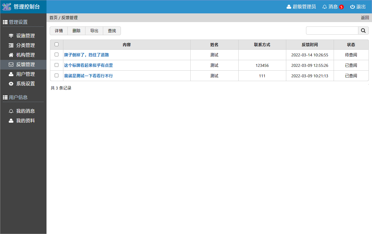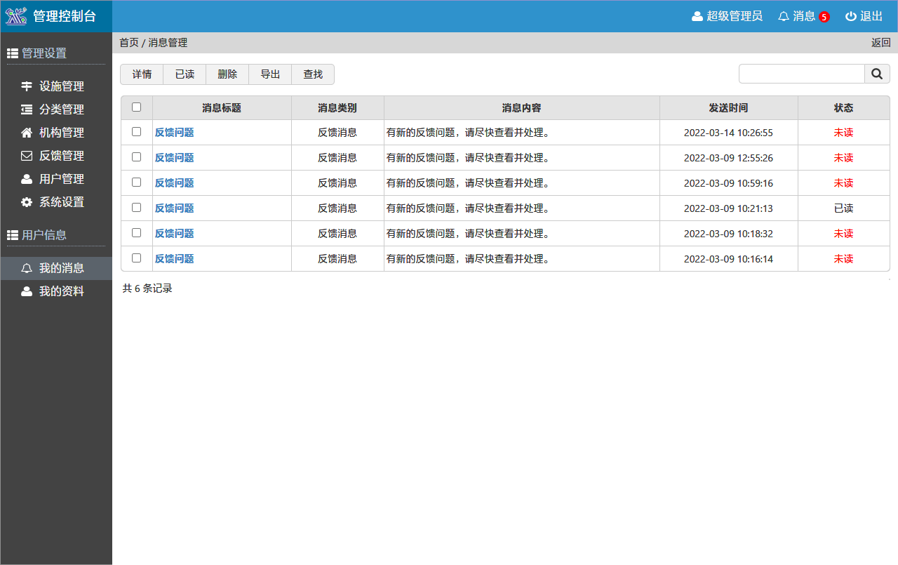 設(shè)施管理系統(tǒng)擁有完善的后臺(tái)管理功能,可按列表添加設(shè)施設(shè)備,可按層級(jí)添加分類、機(jī)構(gòu)??梢蕴砑佣鄠€(gè)管理用戶,并設(shè)置不同管理權(quán)限。當(dāng)收到反饋信息后,能及時(shí)顯示新消息數(shù)量。在反饋管理模塊中,可查看當(dāng)前反饋的信息列表,及時(shí)處理對(duì)應(yīng)問題。