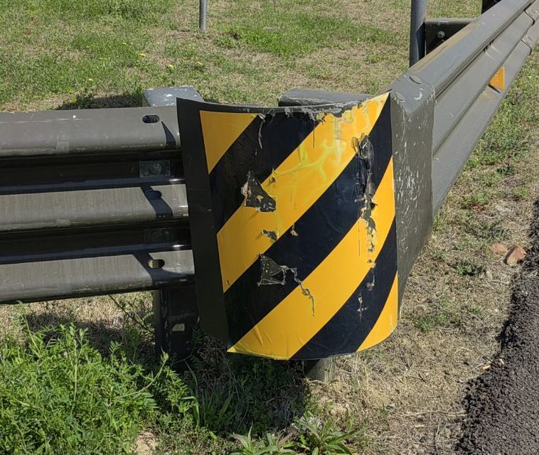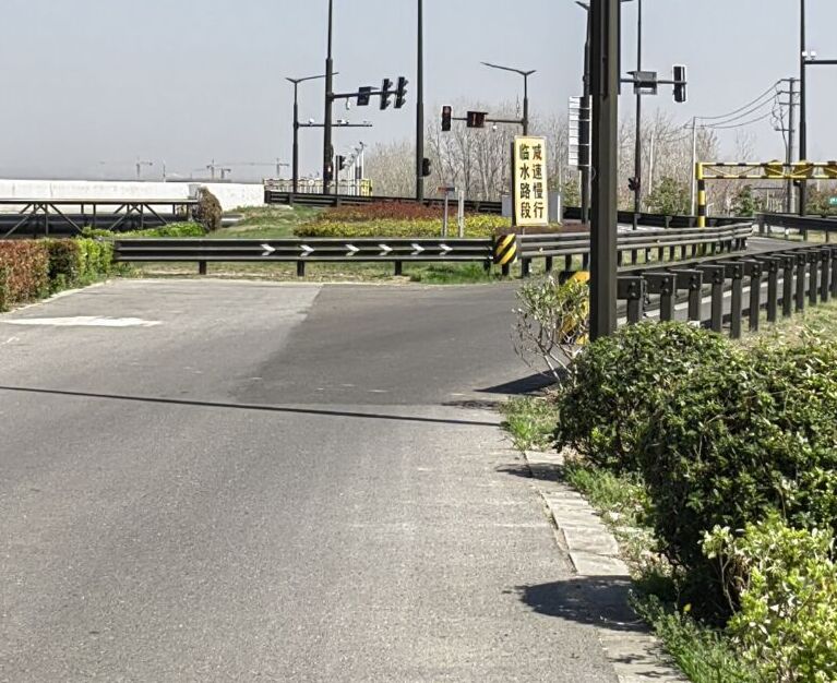 如下圖:前方道路突然向右改道,與前方主線道路交叉接入,僅靠正前方的護(hù)欄上黏貼6個反光膜向右箭頭(反光膜已基本散失反光效果),我們走近可以發(fā)現(xiàn),護(hù)欄端頭上“傷痕累累”,可見不知有多少次的碰撞事故曾發(fā)生過。下圖左:前方突然向右改道;下圖右:護(hù)欄端頭傷痕累累。