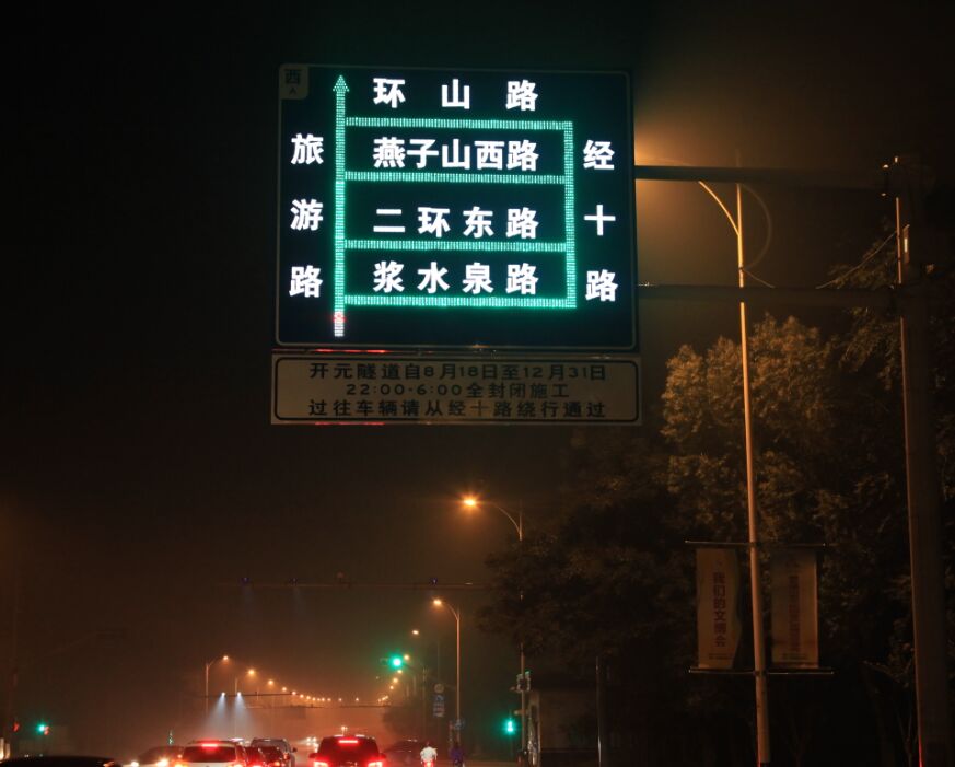 2、標志版面整體采用主動發(fā)光技術(shù),路網(wǎng)部分嵌入三基色LED光帶誘導(dǎo)屏體。