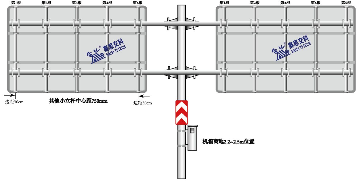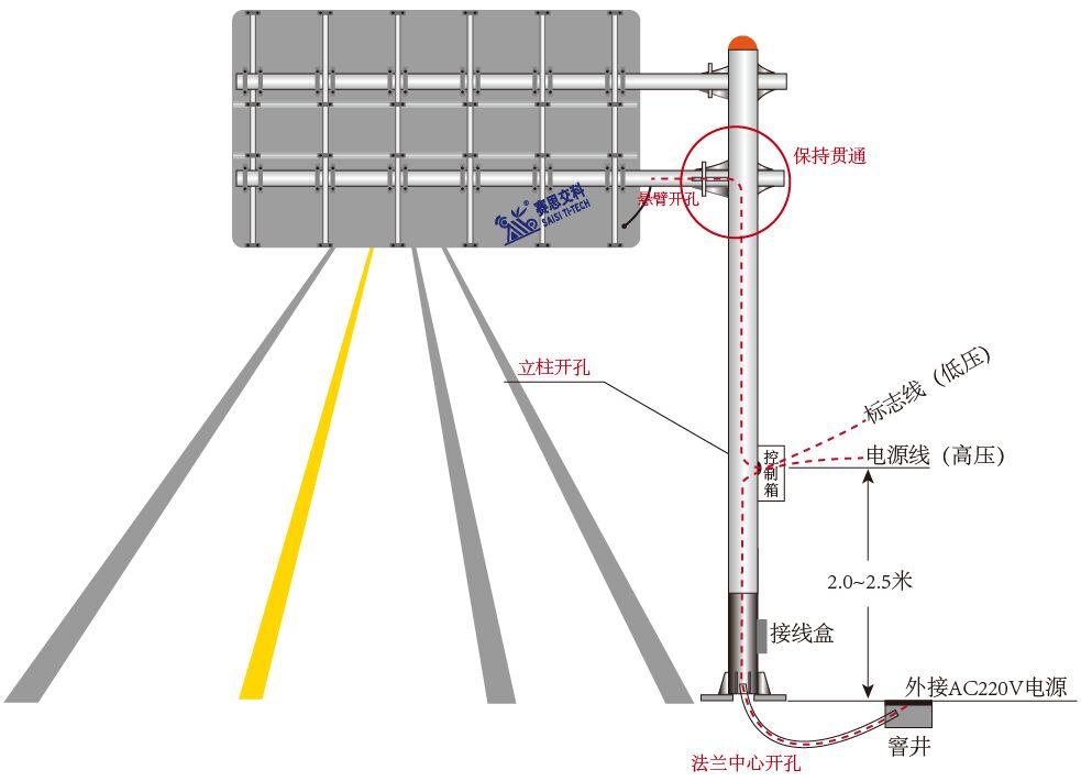 (3)安裝控制機箱。首先正確選擇待安裝標(biāo)志所對應(yīng)的機箱,不同標(biāo)志對應(yīng)不同機箱(因機箱最大承受負(fù)載不同,在機箱上貼有對應(yīng)標(biāo)志版面),不得隨意混雜機箱使用。新建桿件應(yīng)按下圖所示開孔,讓管線在桿件內(nèi)部;控制箱安裝于路外一側(cè),離低高度約為2.2~2.5米,此高度,單人無法夠著;若有故障需檢修時,人字梯也方便檢修。