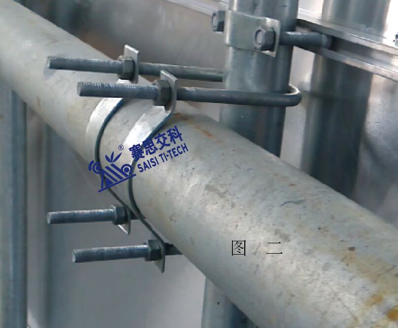 (2)將小圓管固定在懸臂上。用兩只U型卡,如圖下圖所示,安裝于懸臂桿的上下,一端套在小圓管上,一端上下貼在懸臂上,用懸臂對應(yīng)尺寸的半片抱箍,在外側(cè)固定。(注:擰螺絲時,先不要一步擰緊到位,略緊即可,待全部抱箍、U型卡安裝到位后,檢查無誤時,再最終擰緊加固;有誤時,方便調(diào)整、修正。)