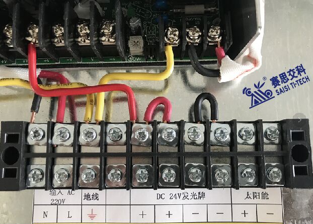 (4)控制線接電。本操作必須為持證的專業(yè)電工!!標(biāo)志牌背面出1根2芯電纜線,內(nèi)部工作電壓為DC24V,注意區(qū)分電線的正負(fù)極(具體供貨隨附的《安裝說明書》會詳細(xì)列明),將這兩根線接入"DC發(fā)光標(biāo)志牌"所示接線端子上,嚴(yán)謹(jǐn)接入旁邊的高壓區(qū)??!接線板如下圖所示。將“空開”按鍵下拉至“關(guān)閉”狀態(tài) ,再將市電接線接入左側(cè),輸入AC220V的接線端子,在開啟電源前,先檢查以下接線,確保準(zhǔn)確無誤后,方可開啟電源。注:控制系統(tǒng)為自動光控(白天不亮,夜晚自動開啟),白天安裝時,需測試,可用黑色物蓋在控制箱的光敏端子上,模擬夜晚效果。