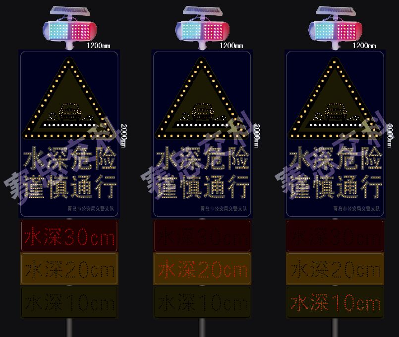 在積水區(qū)域提前設(shè)置告知標(biāo)志,讓路段駕駛?cè)藛T能提前改道繞行,減輕擁堵壓力,規(guī)避深水行車危險(xiǎn)隱患。如下圖所示智能型主動(dòng)發(fā)光標(biāo)志。