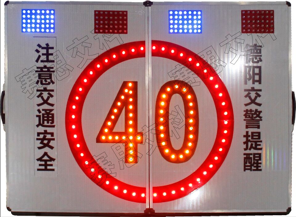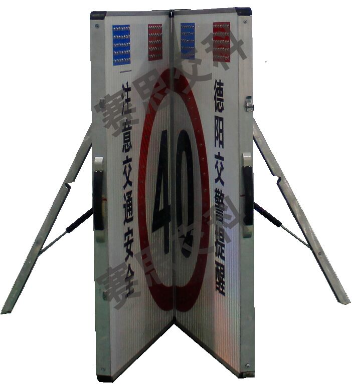 2、標(biāo)志版面設(shè)置LED發(fā)光限速標(biāo)志圖案,上置2組(紅爆閃燈+藍(lán)爆閃燈),兩邊設(shè)置交通警示標(biāo)語或管制單位。標(biāo)志整體展開后,配置支撐架,放置于管理路段,標(biāo)志閉合時,配有手提把,警員可輕松提攜,方便、便攜。