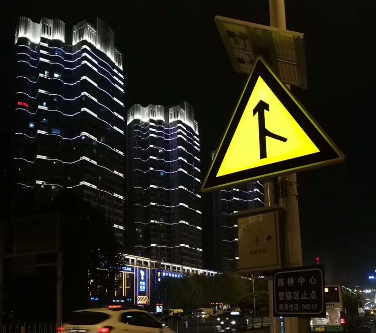 標(biāo)志版面整體發(fā)光,對于禁令、警告類有紅、黃、黑等深色系列反光膜的,能通過版面中的白色透光膜來反襯圖案,標(biāo)志整體發(fā)光面柔和,適合亮化、景觀等暗環(huán)境中的發(fā)光點(diǎn)綴。
