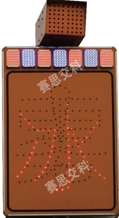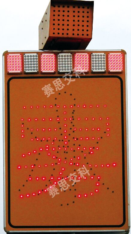 3、標志版面:標志整體為IV類黃色底模,不貼字膜,通過LED線型點陣勾勒出險情圖案或文字,標志上部設(shè)置各四只紅藍交替簡易型爆閃燈。